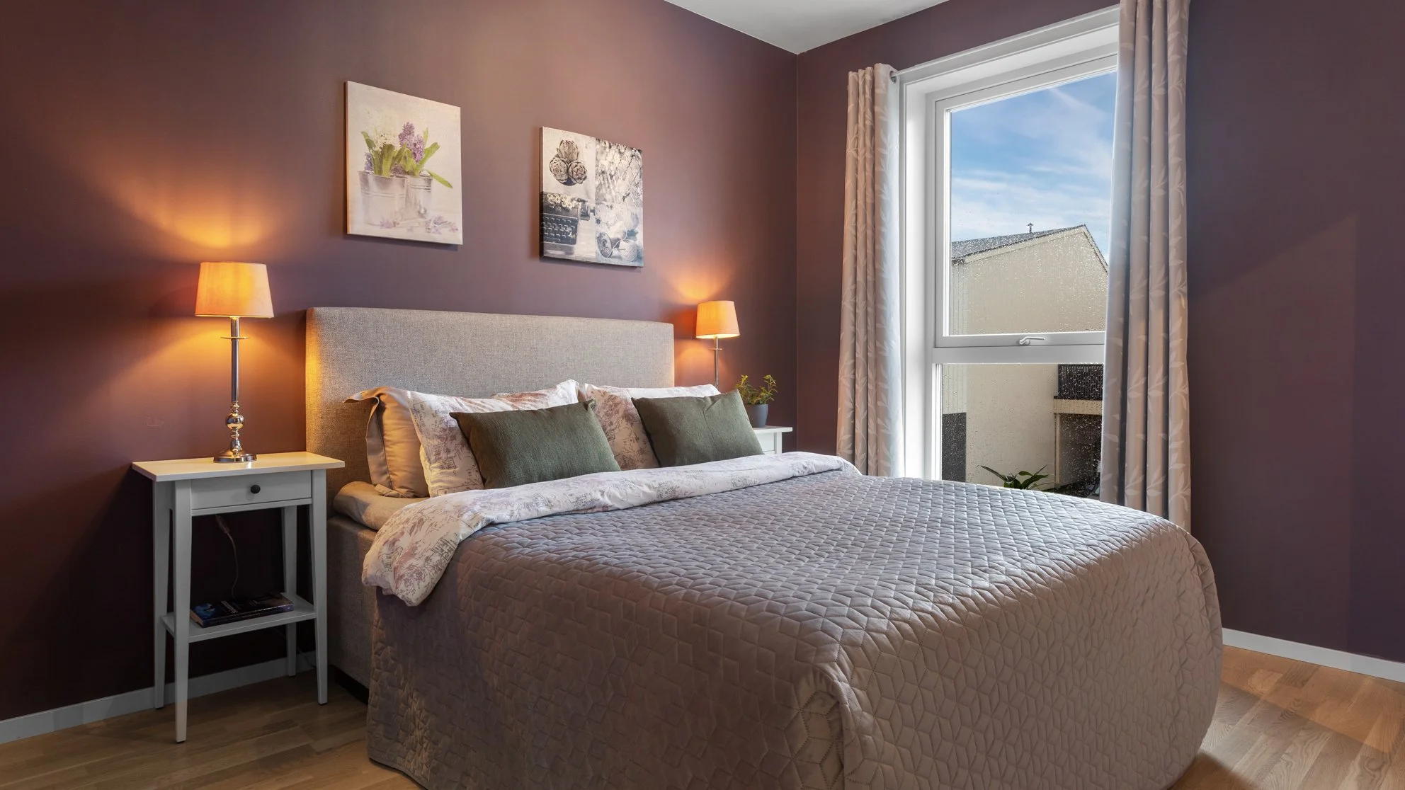 Pynt med stearinlys, planter, en bok på nattordet eller lignende.